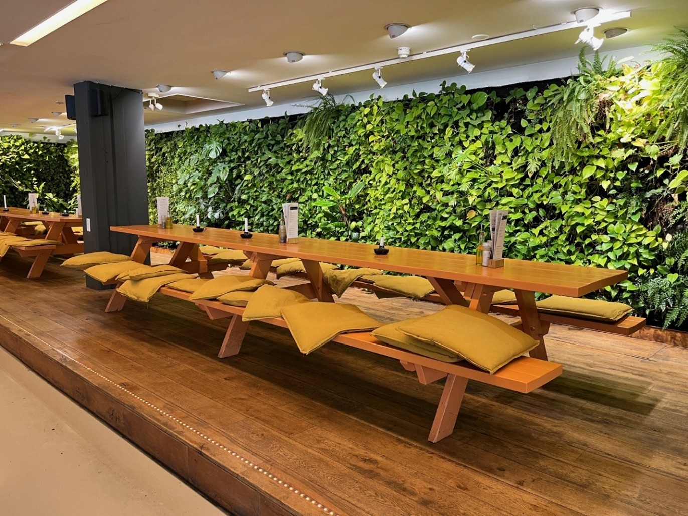 Bij de aankondiging van deze borrel, een hernieuwd initiatief, hadden we al gezegd dat wij ons oog hadden laten vallen op de tafels met banken in het café restaurant voor het geval buiten zitten geen optie zou zijn. ▶︎